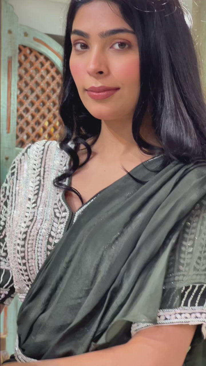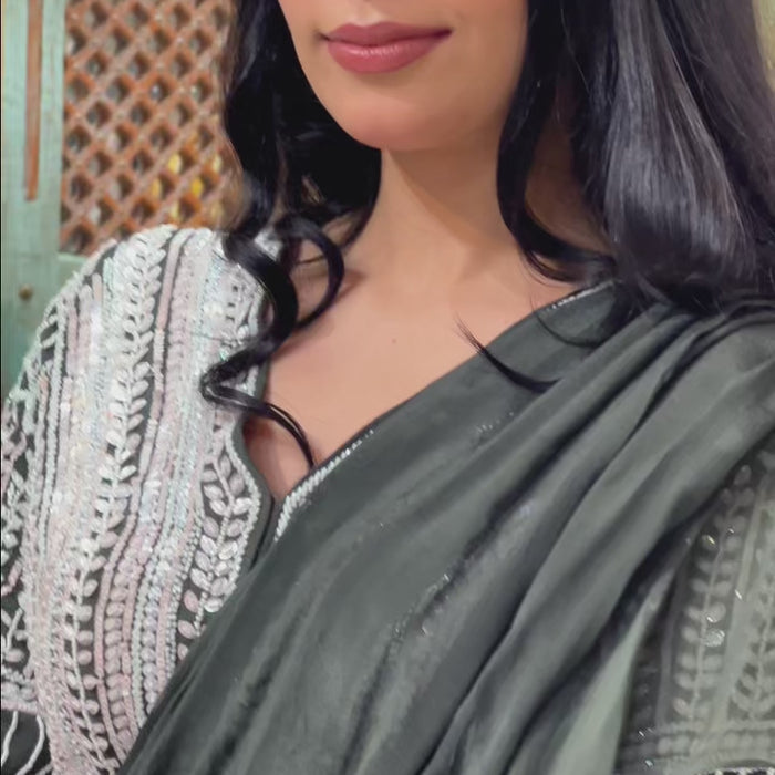 Olive Green Chinon Indowestern with Sequins and Pearl Work